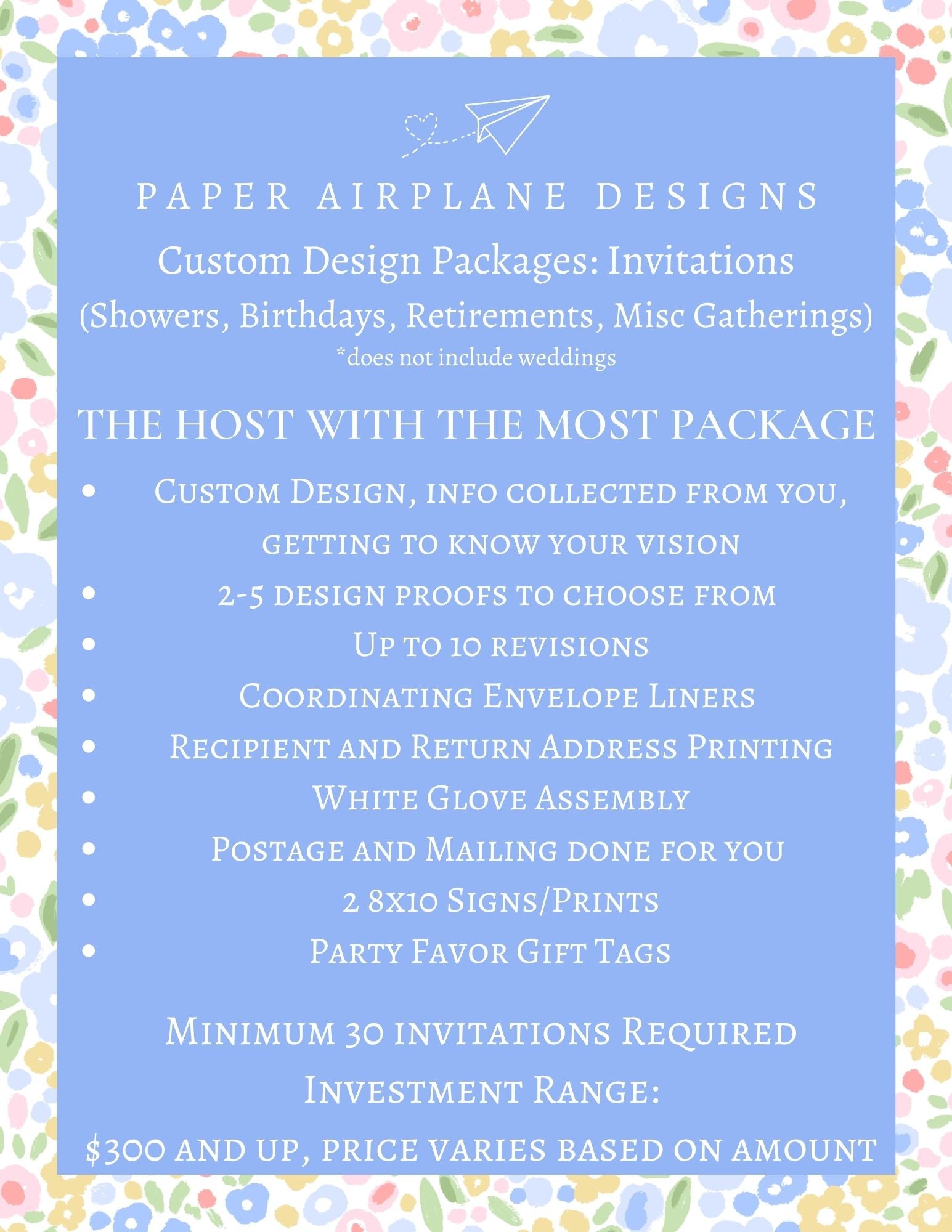 If you are wanting a custom design for any of our products please send a message with as much detail as possible. Paper Airplane Designs takes pride in attention to detail and bringing your vision to life. I believe invitations set the tone for your event and make great keepsakes. Please view below our package offerings and send us an email to get started so I can create the perfect invitation to wow your guests.