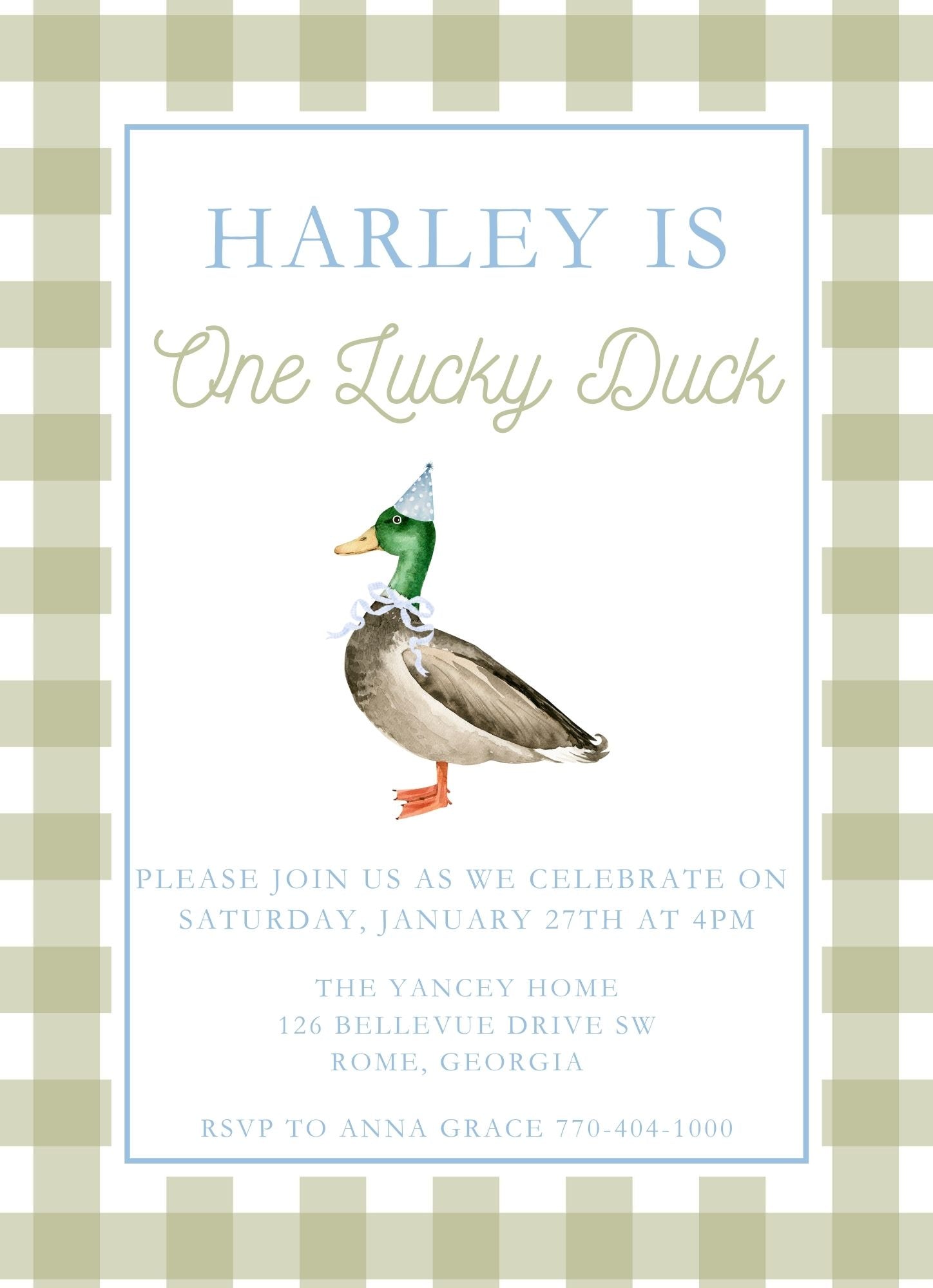 5x7 ONE lucky duck invitation, includes invite and blank envelopes